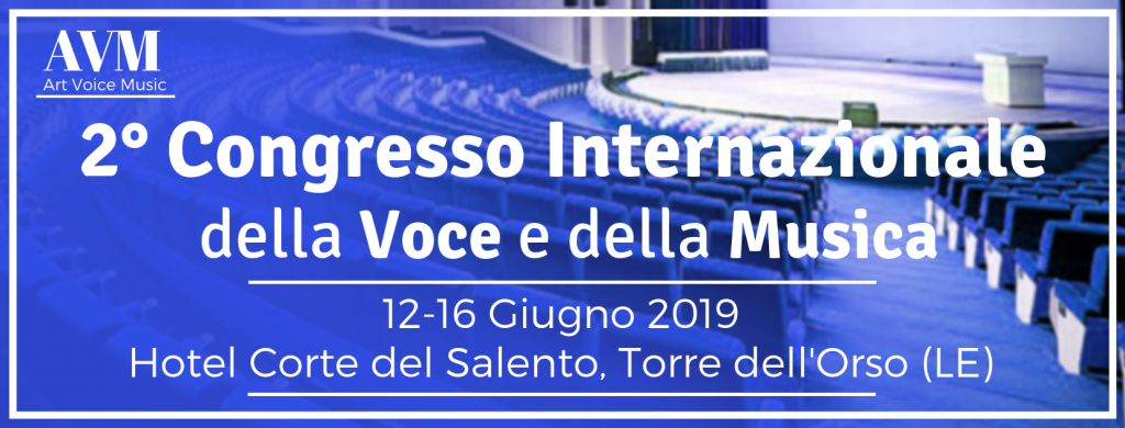 Art Voice Music presenta il:2° CONGRESSO INTERNAZIONALE della VOCE e della MUSICA 12-16 Giugno 2019Corte del Salento, Torre dell’Orso (LE) Rivolto a CANTANTI, ATTORI, PERFORMER, LOGOPEDISTI, DOPPIATORI.Sarà suddiviso in un percorso ESCLUSIVO , per professionisti (insegnanti di canto, attori professionisti, cantanti in carriera, musicisti, logopedisti) e in un percorso con un programma diverso per gli studenti di conservatorio o di un’Accademia .Per tutte le informazioni inerenti il Congresso, Vi invitiamo a contattare la Responsabile della Segreteria Nazionale.Vi aspettiamo! https://www.facebook.com/ArtVoiceMusic5